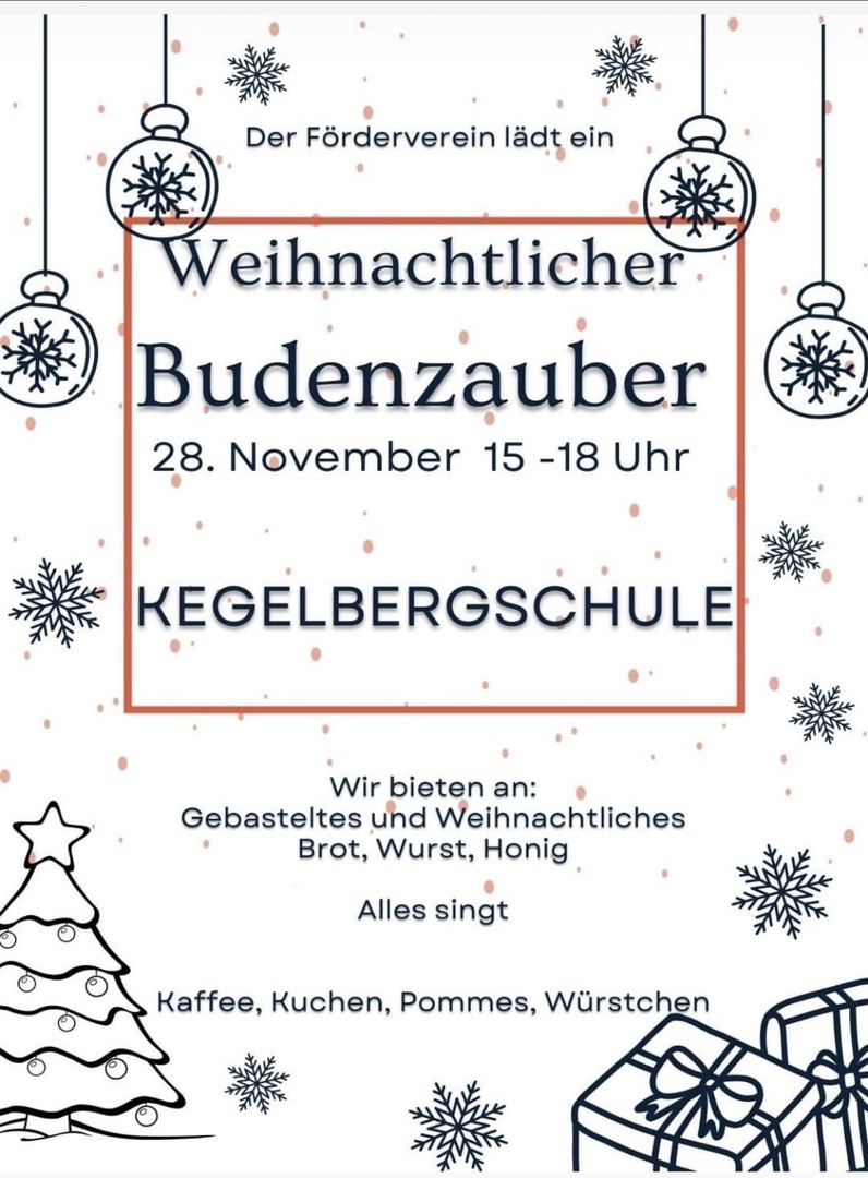 Wir laden Sie herzlich zu unserem Budenzauber am 28. November von 15:00 Uhr bis 18:00 Uhr in die Kegelbergschule ein.